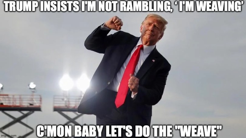 “The Weave” – In September, as it started to become clear that Trump was having difficulty sustaining coherent thoughts and speaking in complete sentences, he tried to rebrand his incoherent rambling as purposeful. He even gave it a name, calling it “the weave.” He would then work in a mention of “the weave” as part of his style, veering from topic to topic because he had a lot of wisdom to impart and couldn’t be constrained by the usual way losers finished one thought before starting another.